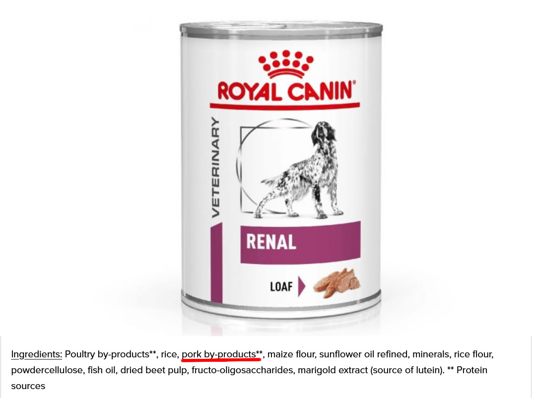 As part of the study, 31 commercially available foods were categorised as either plant-based, poultry-based, red meat-based (beef and lamb), or veterinary renal diets (many of which contain pork fat as shown below).